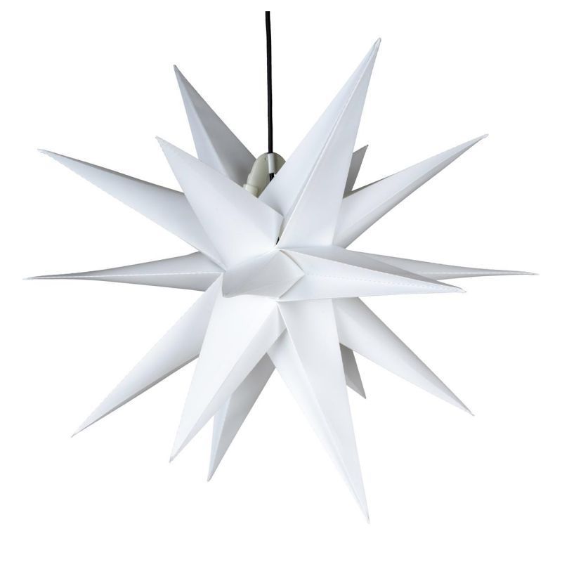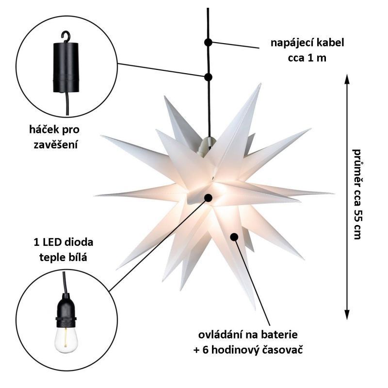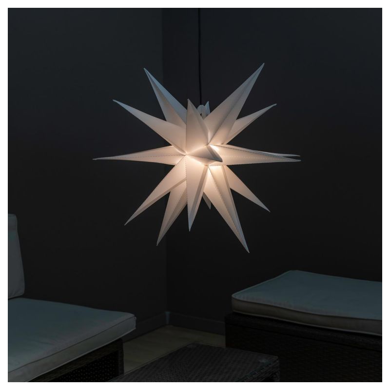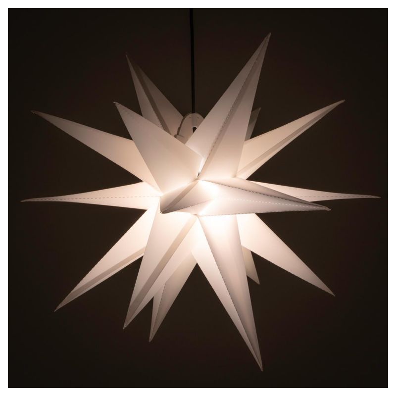 Vánoční hvězda z vysoce kvalitního PVC rozsvítí nejen Vaše okna, ale také celý domov. Lze ji volně zavěsit do prostoru. Díky napájení na baterie nebudete závislí na přístupu k zásuvce. Zkrášlete si svou domácnost touto tradiční dekorací v moderním provedení a v bílé barvě.