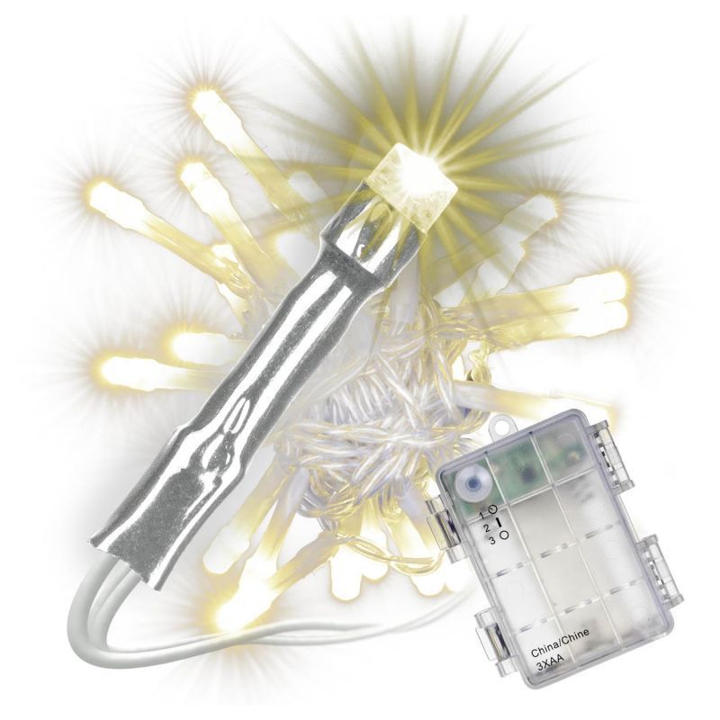 Už nikdy neměňte žárovky. LED technika Vám to umožní. Jedna žárovka konvenčních světelných řetězů spotřebuje tolik energie, co celý řetěz LED diod. LED diody jsou navíc odolné vůči nárazům a nevytvářejí žádné teplo. Tento světelný řetěz se výborně hodí jako dekorace Vašeho domu či zahrady. Díky napájení na baterie máte při dekorování zcela volnou ruku, jelikož nemusíte přemýšlet nad tím, kde máte k dispozici volnou zásuvku. Díky zabudovanému časovému spínači se můžete sami rozhodnout, kdy má se Vaše osvětlení zapnout. Jednoduše si tlačítkem navolíte čas, ve kterém se Vaše dekorace rozsvítí. Nyní je uložen interval, v němž diody 6 hodin svítí a 18 hodin jsou vypnuté.